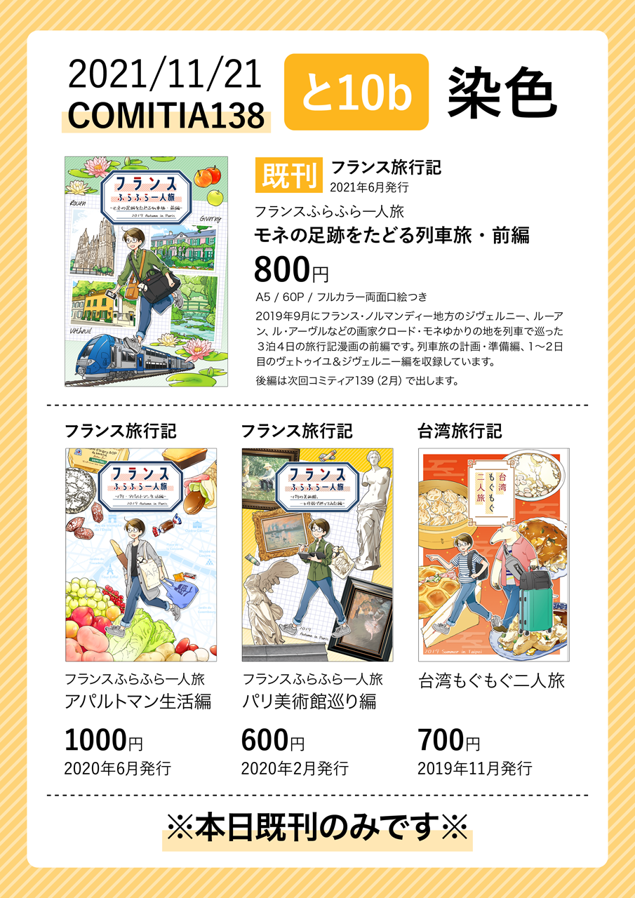 今回のコミティアの新刊予定として告知していた『フランスふらふら一人旅 -モネの足跡をたどる列車旅・後編-』は、申し訳ありませんが2月のコミティアに発行延期になります。