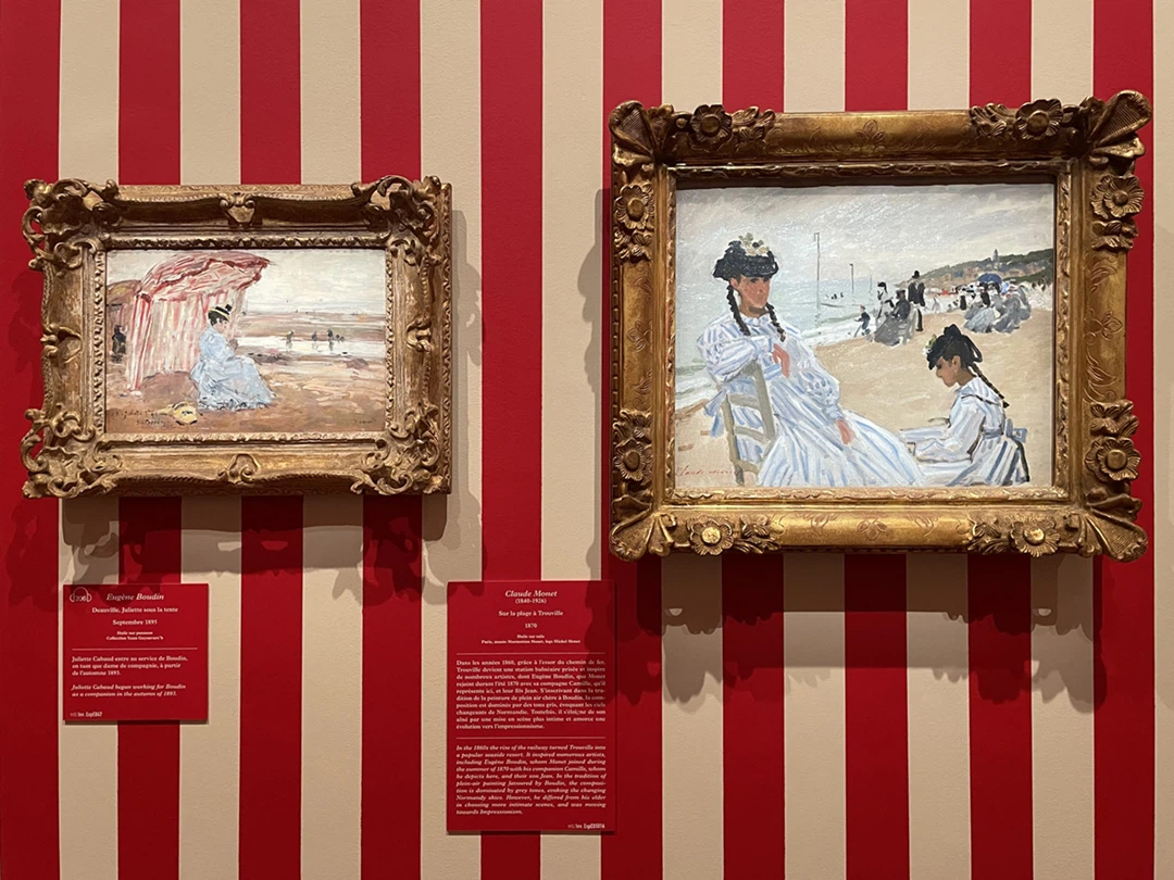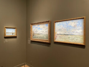 浜辺の風景を描いたモネとブーダンの絵が一緒に並べて展示されている箇所もあり、師弟の絵が並んだ光景に胸が熱くなりました。正確には左のブーダンの絵は1895年のドーヴィル、右のモネの絵は1870年のトゥルーヴィルで描かれたもので、同じタイミングで描いたものではありませんが。(ドーヴィルとトゥルーヴィルはノルマンディー地方にある港町で、川を挟んで隣に位置している)