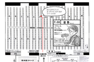 配置図で見ると展示場の出入り口から入ってまーっすぐ進んだ所にスペースあるっぽいです。わかりやすくてありがたい。