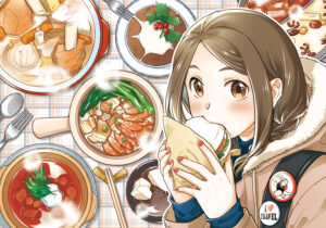 背景の食べ物は左上から右に向かってポトフ、クリスマスプディング、火鍋、煲仔飯(ボウジャイファン)、ボルシチ、お汁粉。