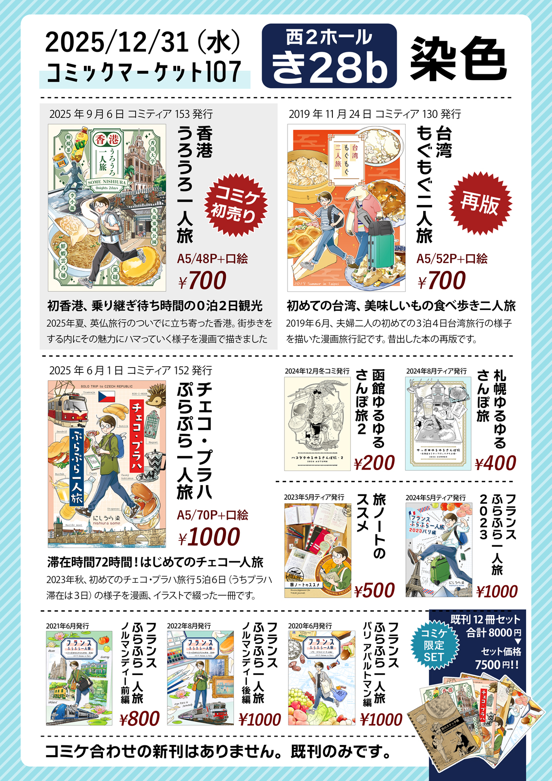 今回冬コミ合わせの新刊はなし、9月のコミティアで発行したコミケ初売りの香港旅行記漫画『香港うろうろ一人旅』と既刊のチェコ、フランス、台湾旅行記漫画、旅ノート本などを頒布します。
