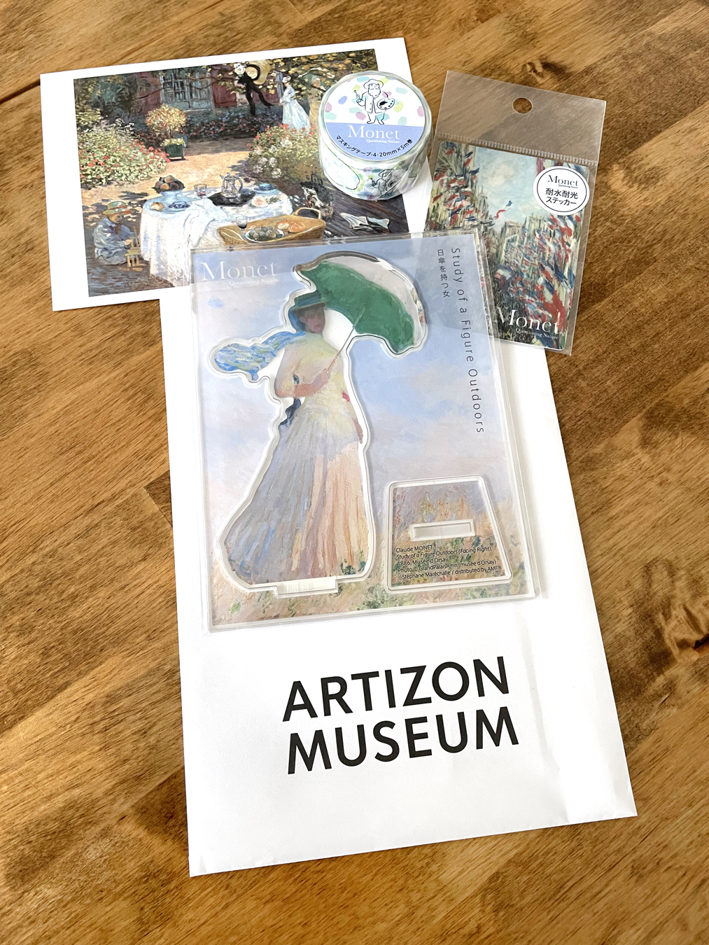 そして自分が購入したのはこちら。上からポストカード、マスキングテープ、ステッカー、日傘をさす女性のアクリルスタンドです。